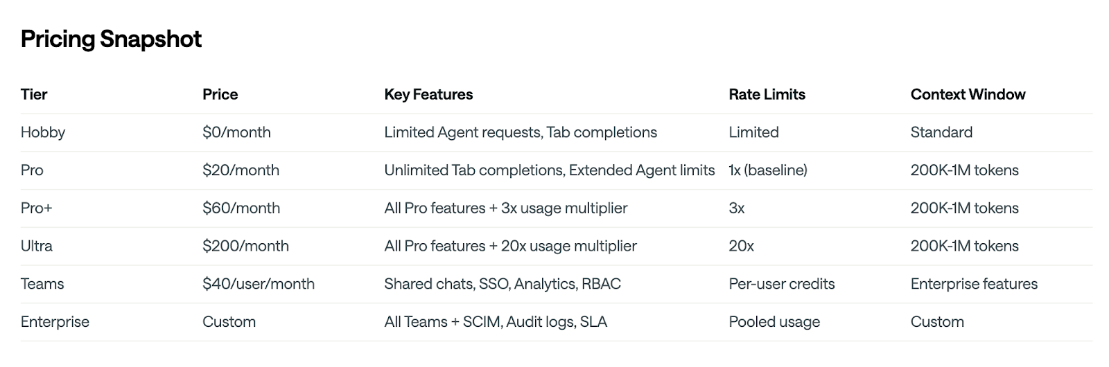 Midjourney differentiates tiers by GPU time allocation. ElevenLabs scales credit pools, model access, and voice quality across tiers, with higher plans unlocking faster processing and advanced features. Cursor scales credit pools by tiers from $20 to $200, providing developers a clear signal of relative intensity. Gamma varies credit consumption rates per action rather than per-seat access.